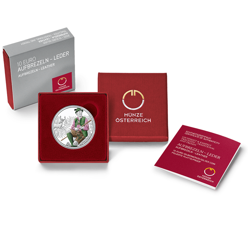 This 10 euro silver coin, entitled Leather, celebrates the robustness and style of traditional leather garments, such as the iconic Lederhosen, fundamental to Alpine cultural identity.