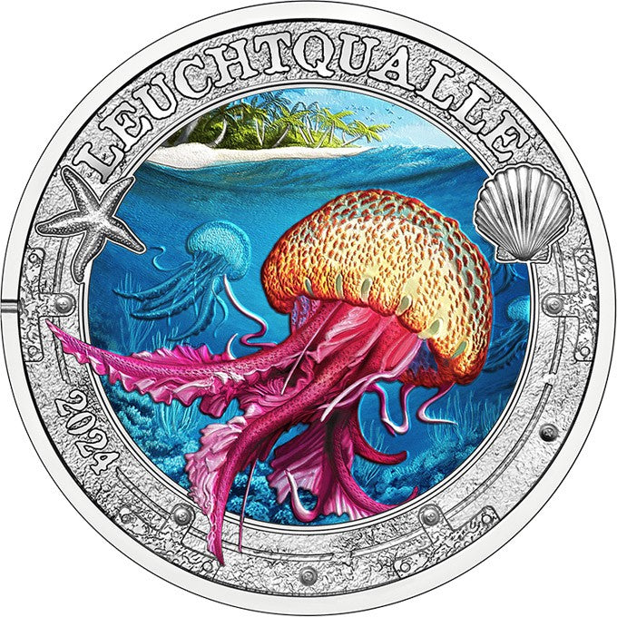 A moeda de 3 euros da Áustria de 2024 dedicada á Medusa Mauve Stinger é a oitava emissão da série "Mundos Marinhos".