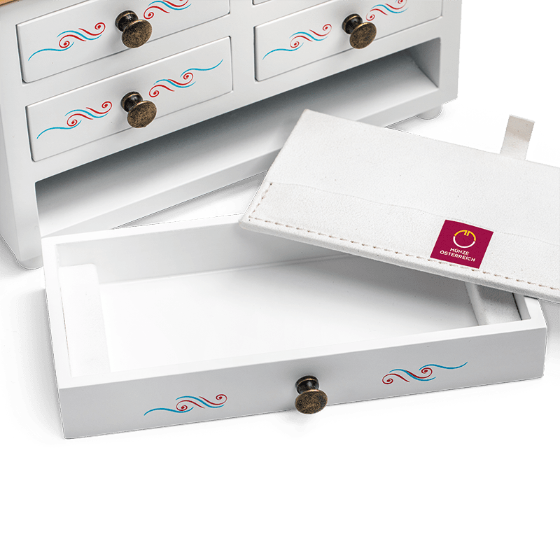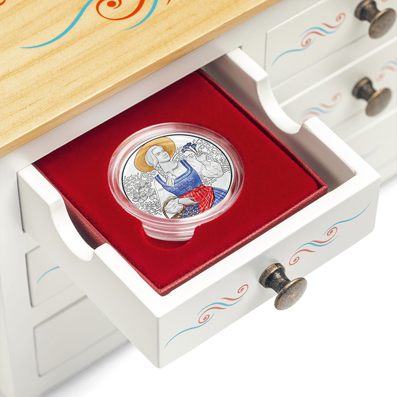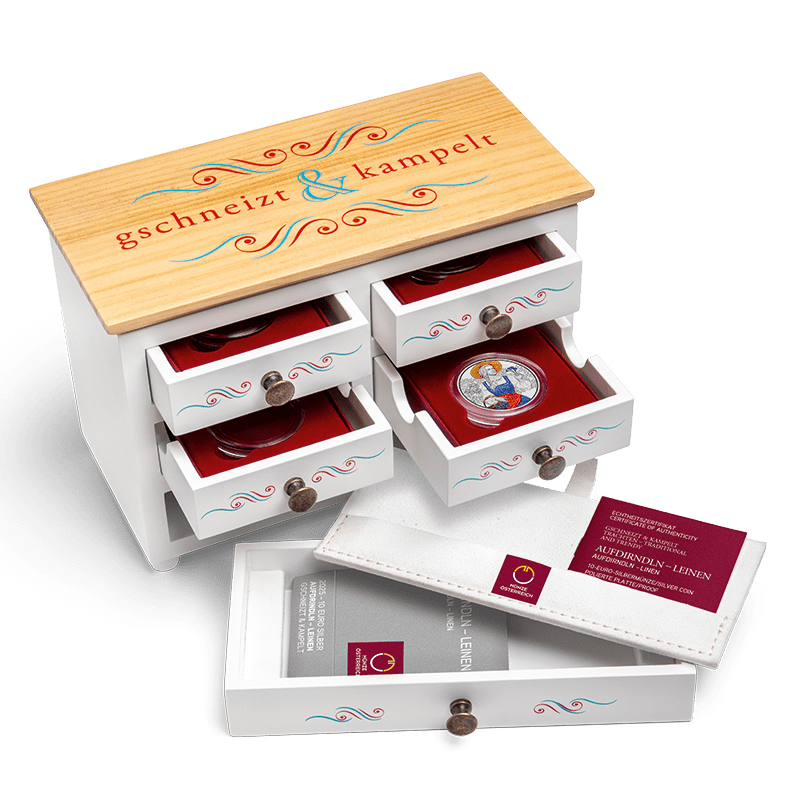 Esta caixa de colecionador foi concebida especificamente para a elegante série de moedas de 10 euros da Áustria, intitulada "Trachten - Traditional and Trendy" (Trajes Tradicionais e Modernos), com lançamento a partir de 2025.
