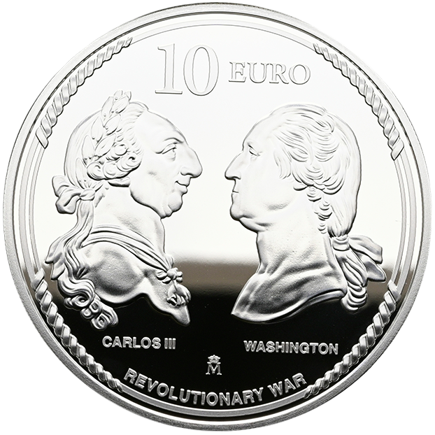 O reverso apresenta os bustos de Carlos III (à esquerda) e George Washington (à direita), destacando o papel que ambos desempenharam na definição do resultado da luta contra os britânicos e na subsequente libertação e independência do povo americano.